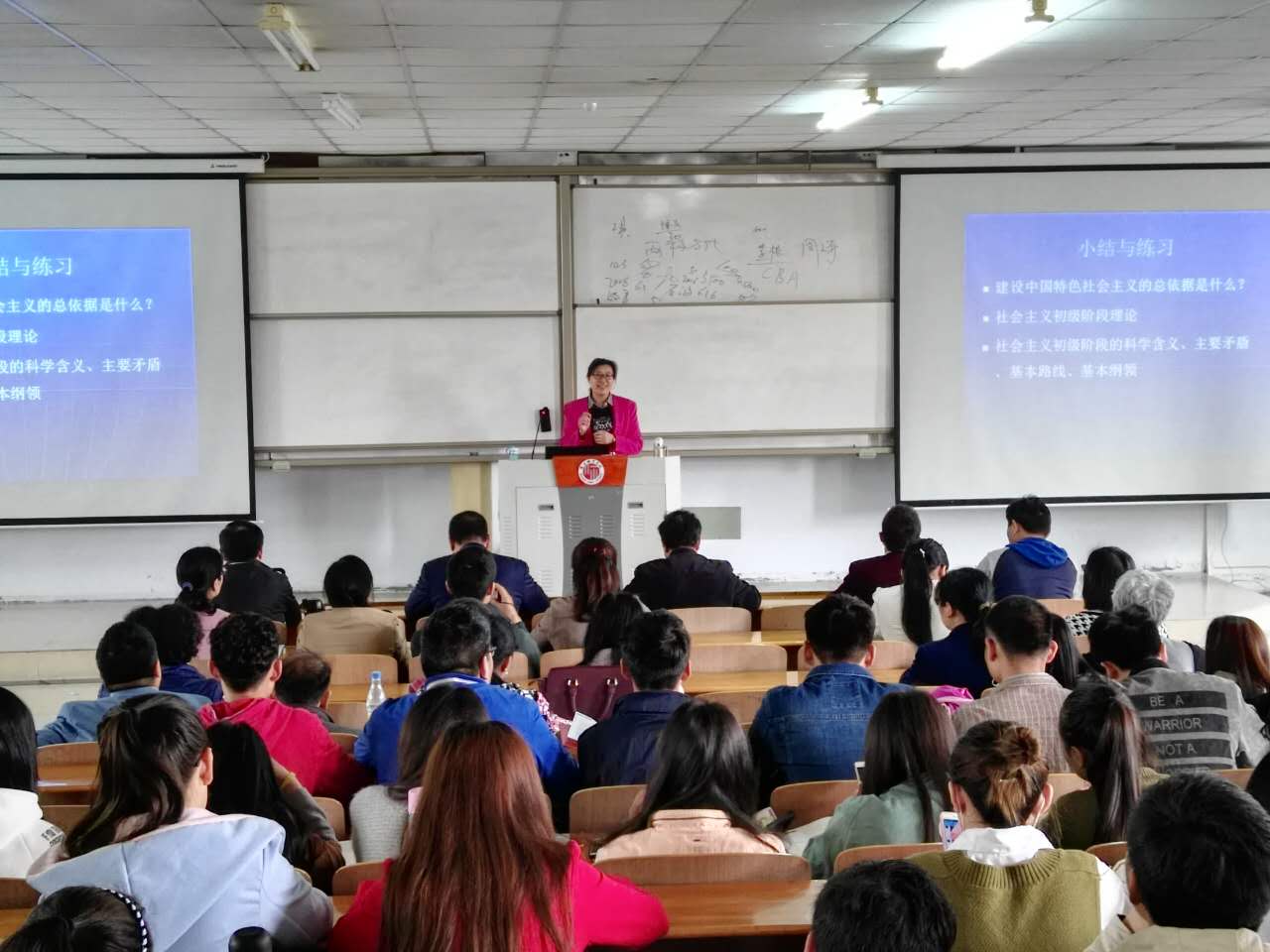 为贯彻落实《商丘师范学院关于思想政治理论课综合改革创新的实施意见》,推进思想政治理论课教学范式改革,4月12日上午,马克思主义学院李金凤教授在平原路校区文史楼320教室举行《毛泽东思想和中国特色社会主义理论体系概论》课堂教学范式改革公开课。马克思主义学院全体教师,教务处、教师评价与教师发展中心负责人和工作人员,部分学院教师共50余人参加了教学观摩活动。