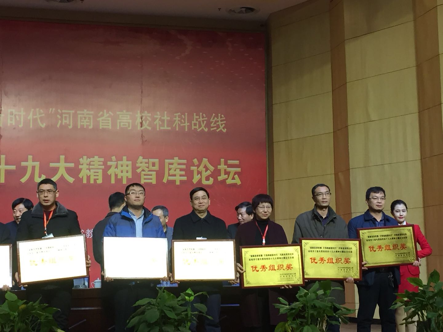 论坛对在“凝聚思想智慧 引领奉献新时代”全省高校社科战线学习宣传贯彻党的十九大精神主题征文活动中取得突出成绩的先进单位和先进个人进行了表彰,我校荣获优秀组织奖,所选送的参赛作品中获特等奖1项、一等奖1项、二等奖2项、三等奖3项。岁有生教授代表我校上台领取了各类奖项。在下午的论坛发言中,我校作为全省6所典型高校之一进行了大会发言。龚志宏教授以《论生态文明制度建设的三维架构》为题,认为适应现阶段中国国情的生态文明制度体系应该包括刚性的源头严防制度体系、有效的过程严管制度体系、威慑的后果严惩制度体系三个维度。龚志宏教授的发言逻辑清晰、言简意赅,得到了与会领导和兄弟院校的肯定和赞扬。(摘自商丘师范学院校园网-学校要闻))