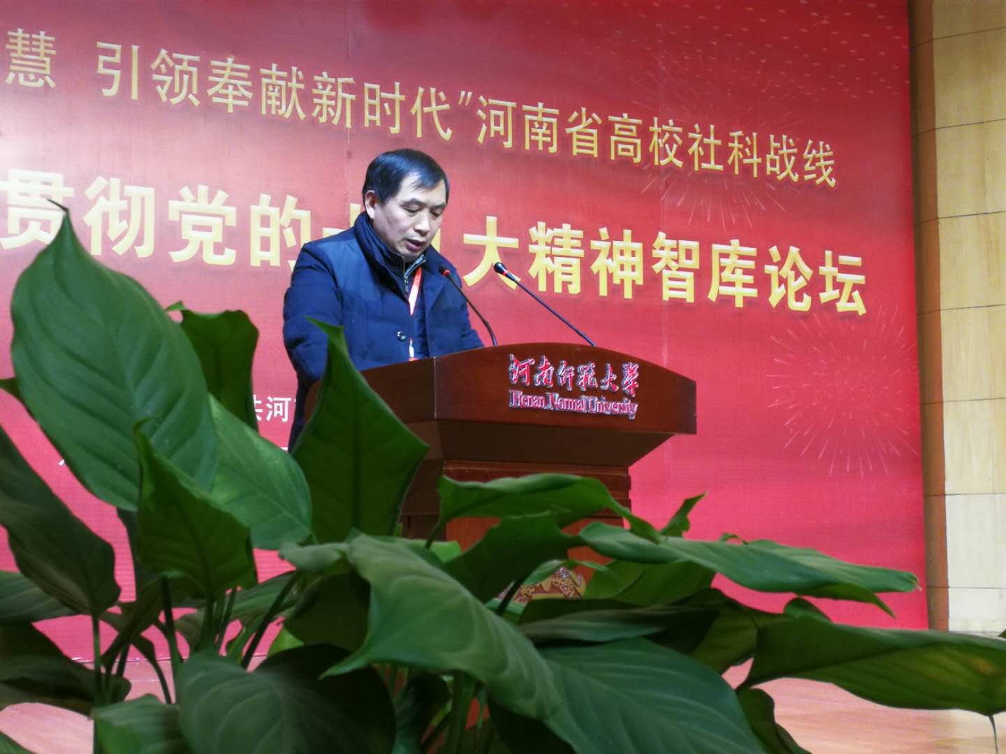 12月23日,全省高校社科战线学习宣传贯彻党的十九大精神智库论坛在河南师范大学音乐厅召开,省委高校工委专职委员高治军,河南师范大学党委副书记陈广文,省教育厅社科处处长王亚洲、副处长刘书伟出席会议,来自全省高校社科战线的189名专家学者参加了论坛。我校马克思主义学院学院院长龚志宏教授、科研处副处长岁有生教授参加了此次论坛,并被指定作论坛典型发言。