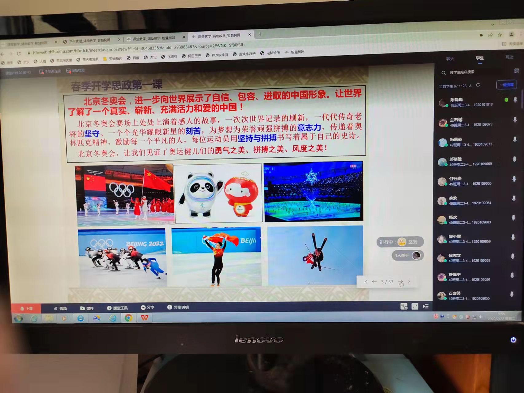 申月霞老师以习近平总书记关于“成绩不仅仅在于能否拿到或拿到多少块奖牌,更在于体现奥林匹克精神,自强不息,战胜自我、超越自我”的重要论述为视角,回望北京冬奥会中国冰雪健儿顽强拼搏、为国争光的永不服输精神,强调奥运赛场上,从来不是只有冠军才值得喝彩,那些身处逆境依然心向高空,明知不可能却依然敢于上场、不懈挑战的人们,都是命运的胜者。激励学生在今后的学习工作生活中,树立勇于战胜自我、超越自我,敢于争先、敢于争第一,从而为中华民族伟大复兴而奋斗的拼搏精神。
