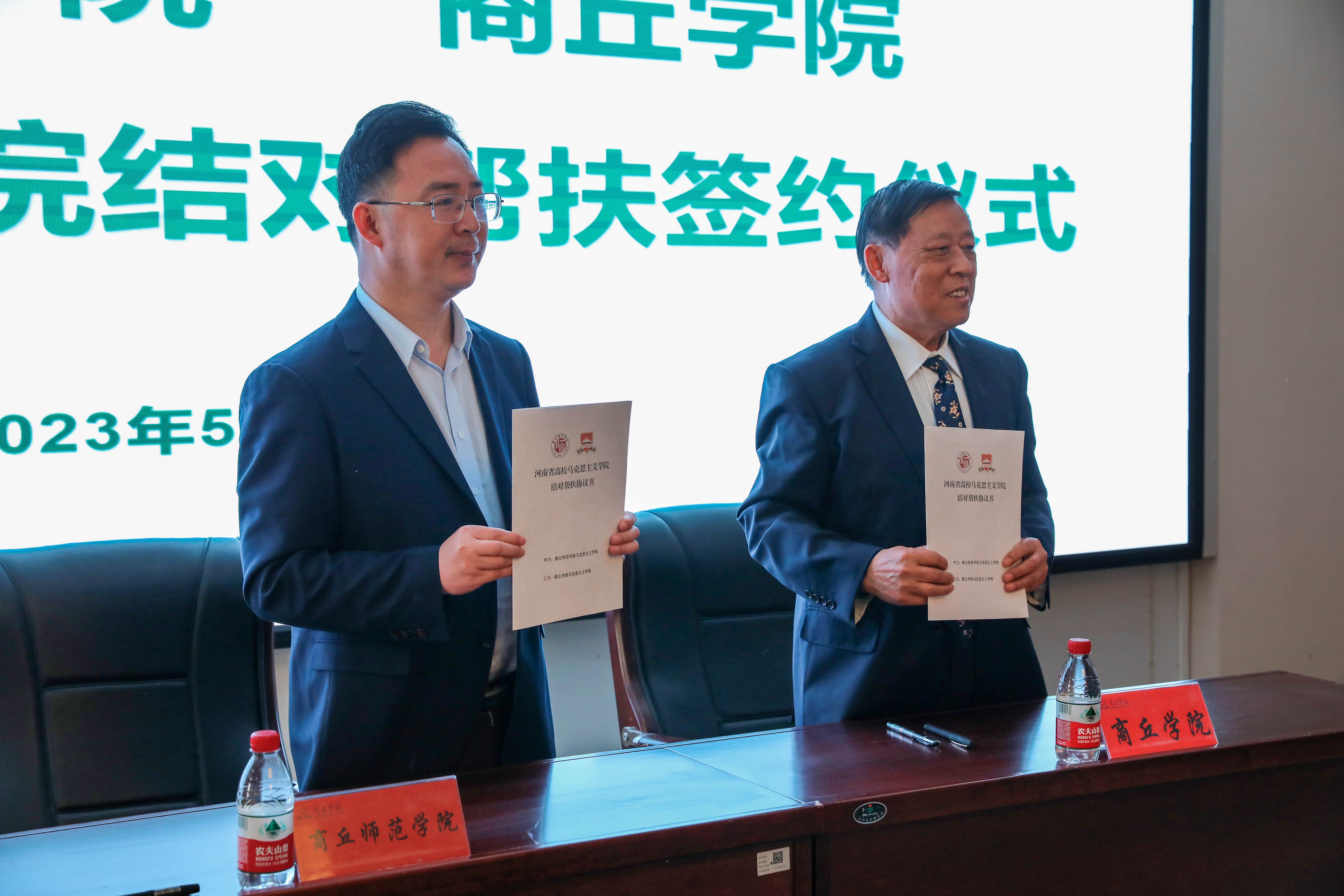 商丘师范学院马克思主义学院院长司永海、商丘学院马克思主义学院院长李克玉在结对帮扶协议上签字。