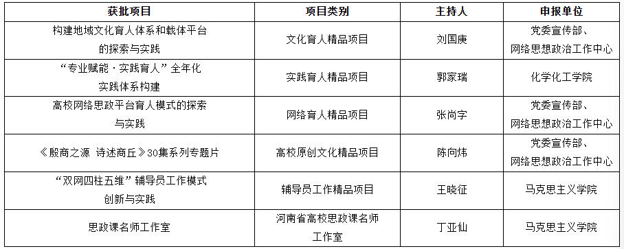 近日,中共河南省委教育工委、河南省教育厅办公室公布了2025年河南省高校思想政治工作质量提升综合改革与精品建设项目入选名单,我校共有6个项目成功获批,获批项目类别、数量实现新突破,标志着我校思想政治工作迈上新台阶。