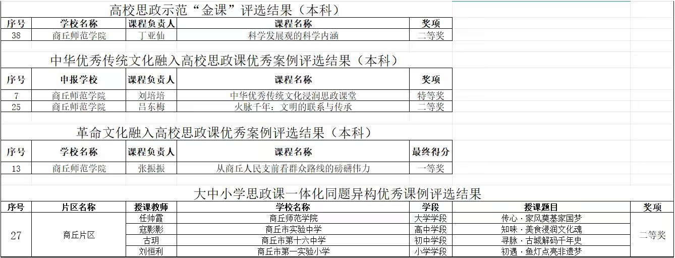 近日,中共河南省委教育工委、河南省教育厅公布了2025年度优秀思政课程资源征集评选结果。马克思主义学院刘培培老师和吕东梅老师分别荣获中华优秀传统文化融入高校思政课优秀案例特等奖和二等奖;张振振老师荣获革命文化融入高校思政课优秀案例一等奖;丁亚仙老师荣获高校思政示范“金课”二等奖;任帅霞老师荣获大中小学思政课一体化同题异构优秀课例二等奖。