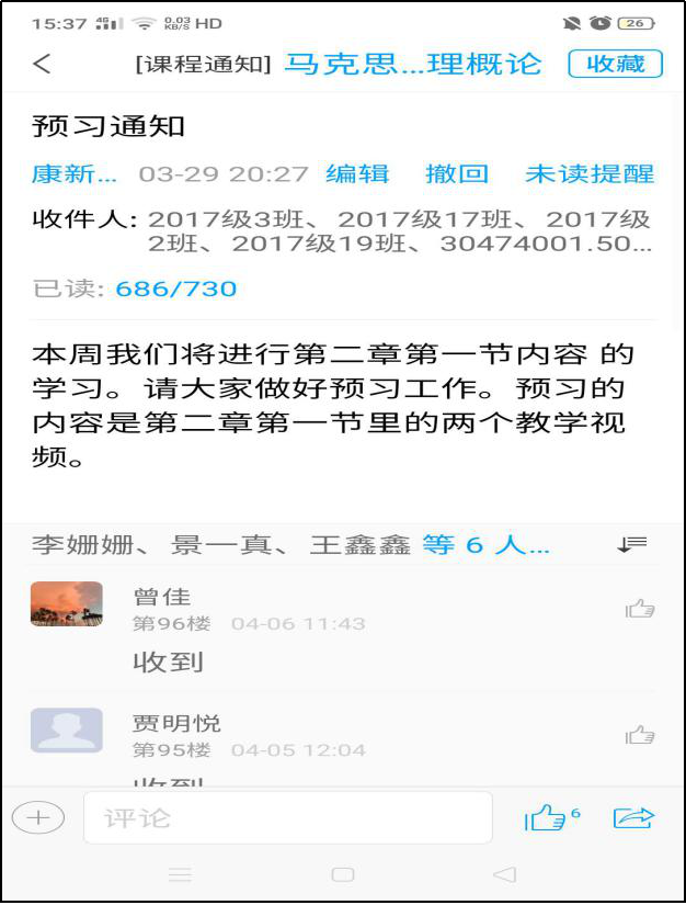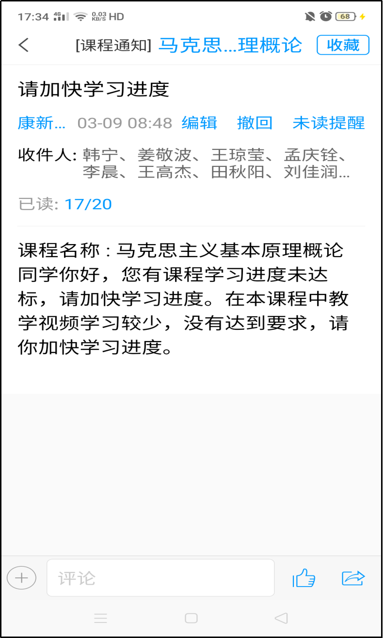 康新亚老师教学环节完整,每周学习结束,都会在学习通上检查学生的学习情况,发放督学通知,真正实现停课不停学,教学不延期。