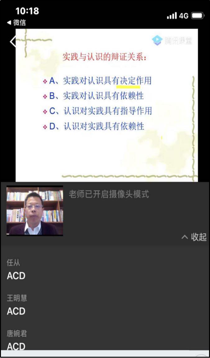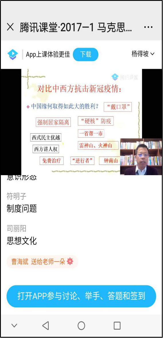 在课堂教学中,围绕“真理的客观性、绝对性和相对性”这一专题,康新亚老师采用腾讯课堂直播教学。在线发放试题,检测上节课学习情况及课前预习情况;贯彻理论联系实际的理念,深入浅出讲授马克思主义基本原理;开展在线讨论,运用当前疫情防控材料引导学生在线发言,结合思政课教学实施“把灾难当教材 与祖国共成长”主题教育。在“真理的绝对性”部分,通过开展“对比中西方抗击新冠肺炎疫情 中国缘何取得如此大的胜利”讨论,引导学生认识中国共产党执政为民的理念,党和政府强大的领导力与执行力,中华民族“一方有难、八方支援”的民族凝聚力,以及“一省帮一市”、全国一盘棋的战略部署;通过对比,引导学生认识西方民主与人权的天然制度缺陷及其虚伪性,进而坚定“四个自信”,增强对马克思主义真理性的认识。在“真理的相对性”部分,引导学生认识关于人生格言警句的精神魅力,同时也让学生认识到“心灵鸡汤”的局限性,明确鸡汤可以有,但要适合而止,从而培养学生保持本真善良的高贵品质与兢兢业业、精益求精的敬业精神。结合批驳美国总统特朗普把新冠肺炎病毒为“中国病毒”的谬论,引导学生讨论“真相离我们有多远”,从而使学生认识到美国政治的虚伪性与欺骗性,理解了实践是检验真理的唯一标准以及实用主义真理观的错误。课堂讨论中,学生参与积极、气氛热烈,或在线连麦、或举手发言、或在聊天框留言,把讨论一次又一次推上高潮。